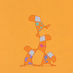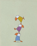 2008Langwerpig schilderij met daarop twee duikertjes waarvan één op de andere zijn rug staat. De duikerjes hebben gele snavels en poten en gestreepte jas aan. Kleuren: Grijs lichtgroen oranje geel.