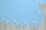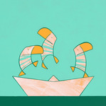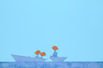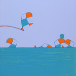 2009Schilderij van drie duikertjes met twee papieren bootjes. De structuur in het schilderij is bereikt door vershillend gekleurde lagen over elkaar heen te zetten en dan af te schuren. Ik vind het belangrijk dat het schilderij er zo simpel mogelijk uit ziet,maar wel interesant blijft, met zo min mogelijk details en zo min mogelijk kleuren.