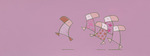 2008Schilderij van een groepje Duikertjes met gebloemde jurken aan die in het rond springen. Het is een langwerpig roze schilderij.