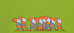 2008Schilderij van duizelingwekkende Duikertjes. Het schilderij lijkt op een stof of behangpatroon doordat de Duikertjes op meerdere plekken uit heet beeld vallen en de tussenruimtes tussen de figuurtjes ongeveer even groot is. De gebruikte kleuren zijn taupe en diverse andere kleuren. Het schilderij heeft een retro vintage uitstraling.
