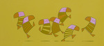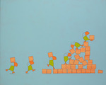 2008Schilderij van een groep Duikertjes die druk bezig zijn met het opstapelen van doosjes. De kleuren van het schilderij zijn lichtblauw oranje en groen.