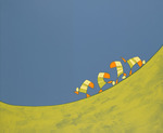 2008Schilderij van een viertal duikertjes die eieren de berg oprollen. Het groen van hun gestreepte jassen komt terug in de berg. De kleuren zijn donkerblauw groen en oranje.
