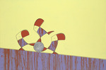 2009Schilderij van drie Duikertjes die met een bal spelen. De bal is gemaakt met geschuurd bladzilver. De gebruikte kleuren zijn geel, rood, en paars.
