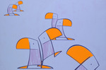 2009Schilderij van een groepje Duikertjes die tegenover elkaar staan. De druipers die ik op dit doek heb gebruikt lopen in de lengterichting. De gebruikte kleuren zijn oranje paars en zwart