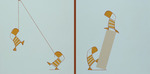 2008Een drieluik met op elk schilderij een Duikertje en een tafel (eettafel, bijzettafel en een salontafel). De duikertjes in hun gestreepte jasjes zijn bezig op de tafels te klimmen of te springen. De schilderijen hebben allemaal hun eigen gele lijst. de schilderijen meten 39 x 39 cm per stuk. de totale lengte komt ongeveer op 150 cm (met lijst en al en een een net stukje tussenruimte) http://www.jasperoostland.com/vergrotingen/12117.html